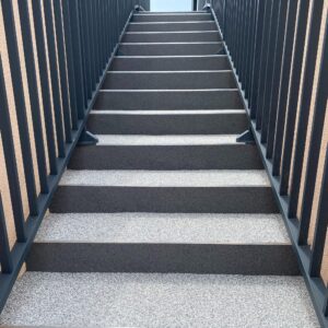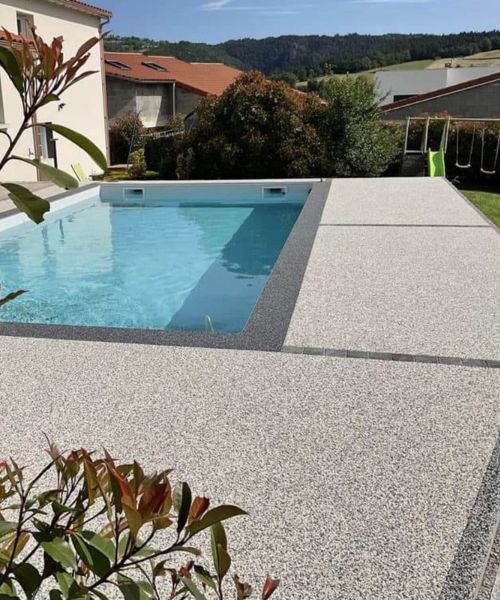 Grâce à sa composition en granulats de pierre naturelle liés par une résine, ce revêtement allie résistance, drainage et design moderne.